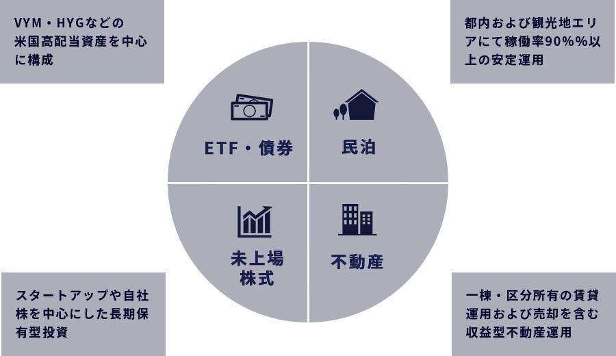 を超える想定利回りを確保。家賃収入により、ローン返済後も安定的なキャッシュフローを生み出しています。また、株式・債券・ETFなどをバランスよく保有し、法人・個人・自社株を含めた総資産額はおよそ